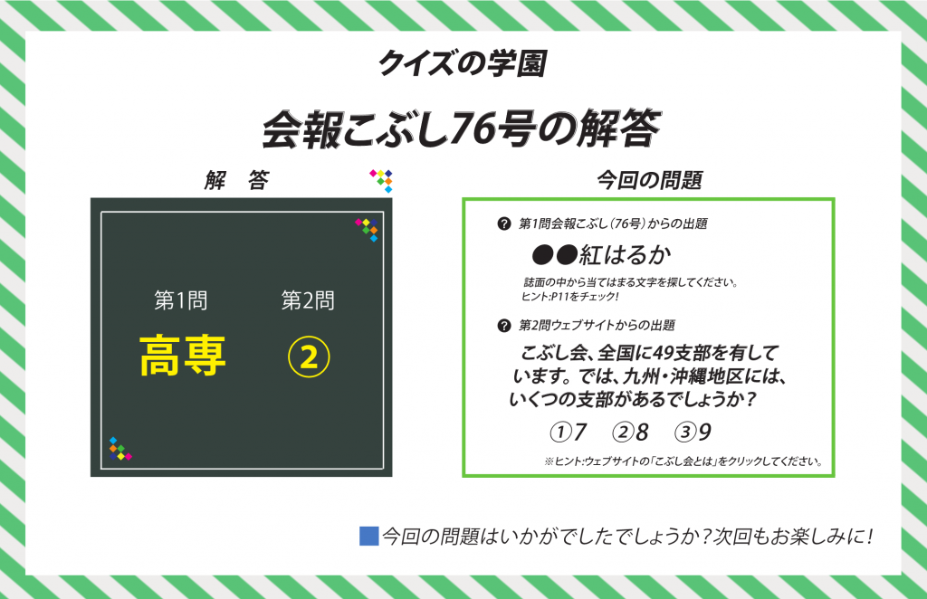 「クイズの学園 VOL.27」の出題は、「会報こぶし VOL.76号の第1問」と「こぶし会ウェブサイトの第2問」、それぞれからの回答をインフォメーションカード(はがき)へ記入し、ご応募いただく方式です。