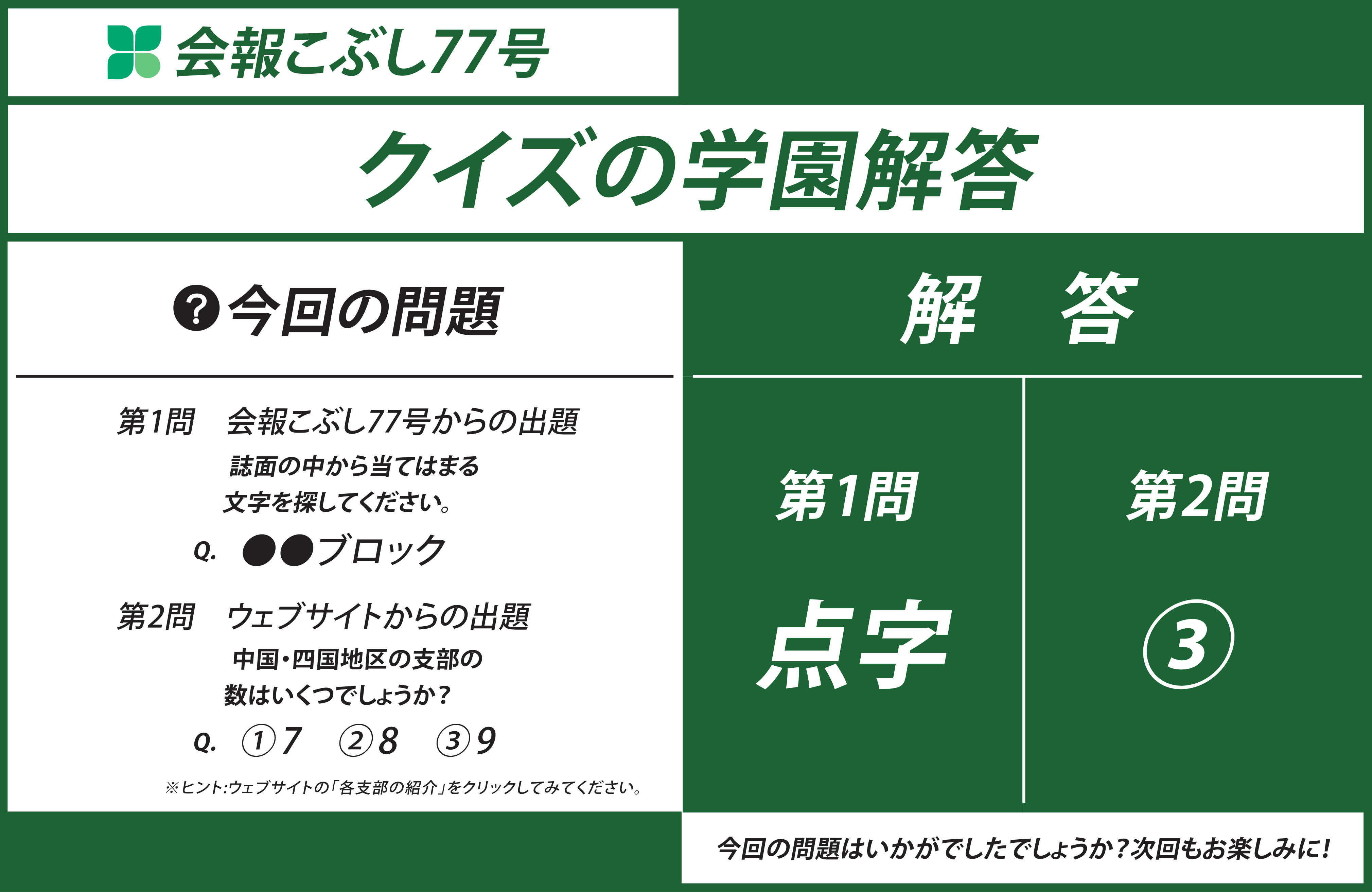 「クイズの学園 VOL.28」の出題は、「会報こぶし VOL.77号の第1問」と「こぶし会ウェブサイトの第2問」、それぞれからの回答をインフォメーションカード(はがき)へ記入し、ご応募いただく方式です。